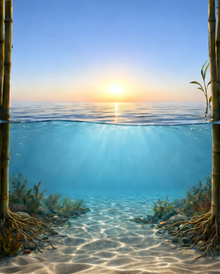 Ao observar os elementos deste cenário, você nota que os bambus conectam o ambiente submerso à superfície. Suas raízes aparentes e o movimento em direção à luz do sol representam a busca pela clareza e pelo equilíbrio.