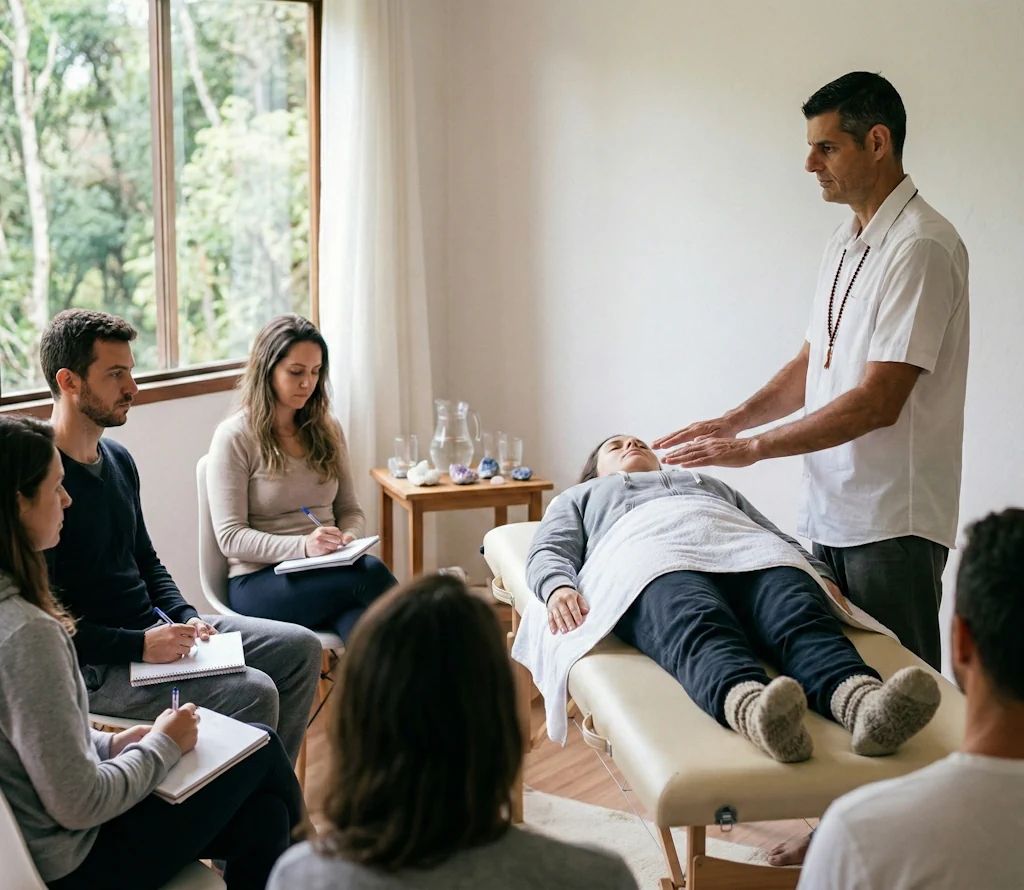 Nos cursos, o foco vai além do aspecto terapêutico. A abordagem inclui autoconhecimento e desenvolvimento interior, sem vínculo com instituições religiosas, com condução clara e estrutura por níveis. O objetivo é formar praticantes que desenvolvam autocuidado consistente e ganhem base segura para aplicar em familiares, amigos ou atendimentos.